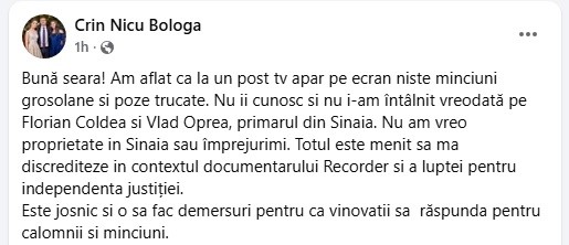Urmare a documentarului făcut de către – Recorder- „Justiția capturată”, în care apare și Crin Bologa alături de alți procurori și judecători protagoniști ai documentarului, exprimându-și anumite puncte de vedere vizavi de tema documentarului, o anumită televiziune dintr-o anumită parte a presei a încearcat să-i compromită imaginea lui Crin Bologa și să-l denigreze prin răspândirea în spațiul public a unor dezinformări, insunuări și manipulări grosolane.